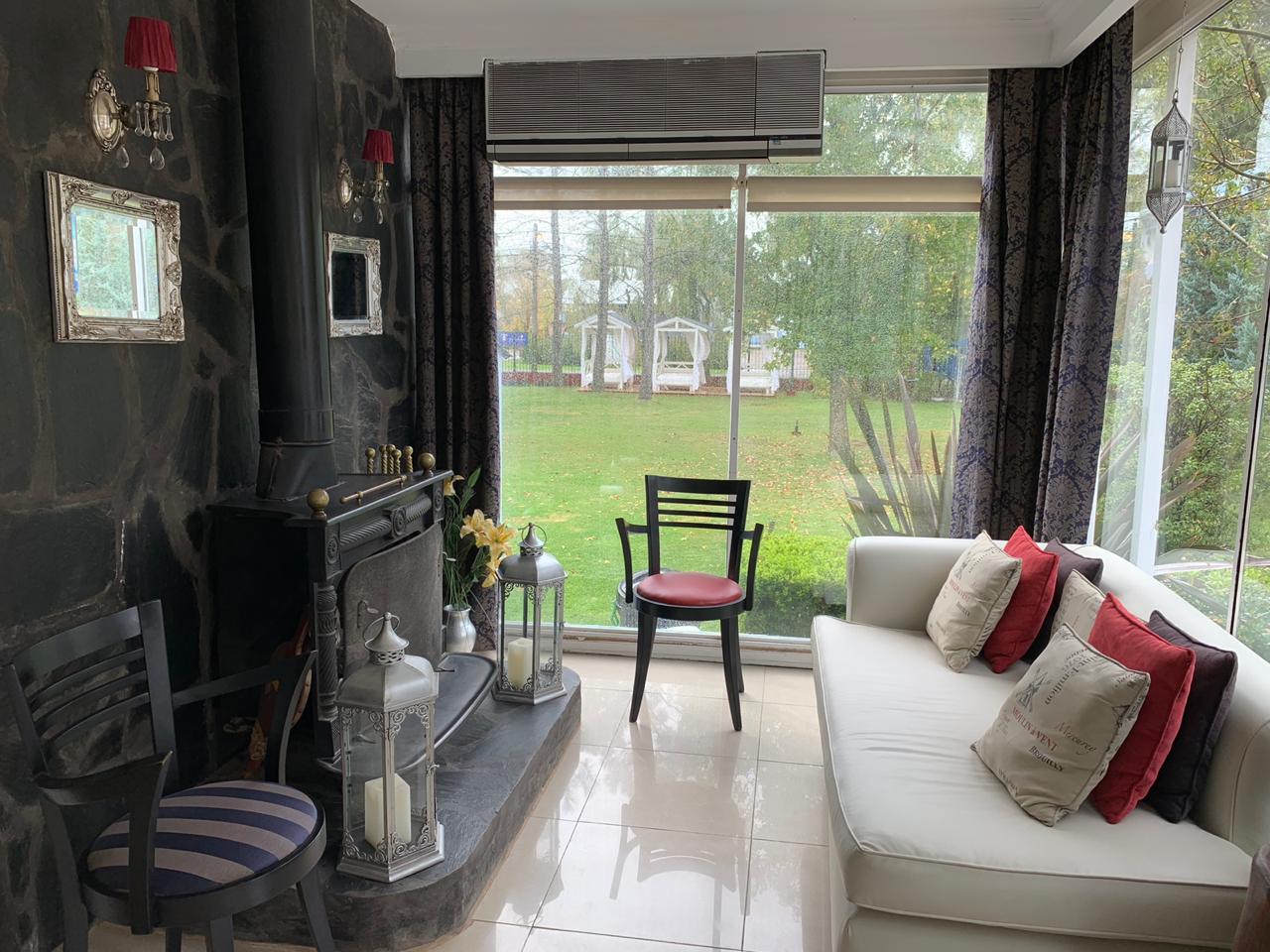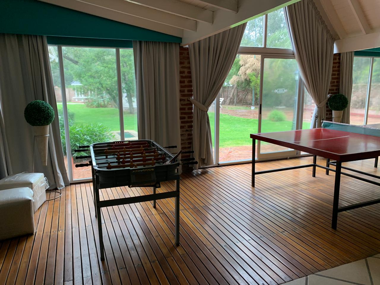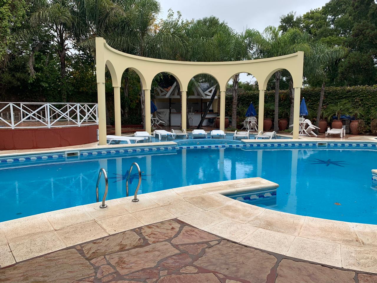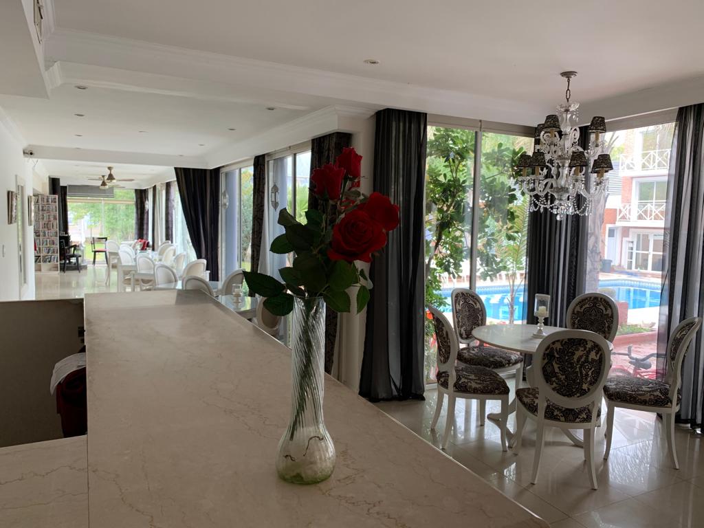 Sala de estar con vista al natatorio, bar y comedor