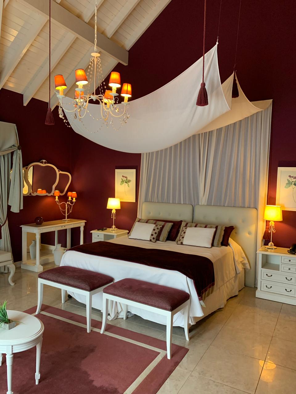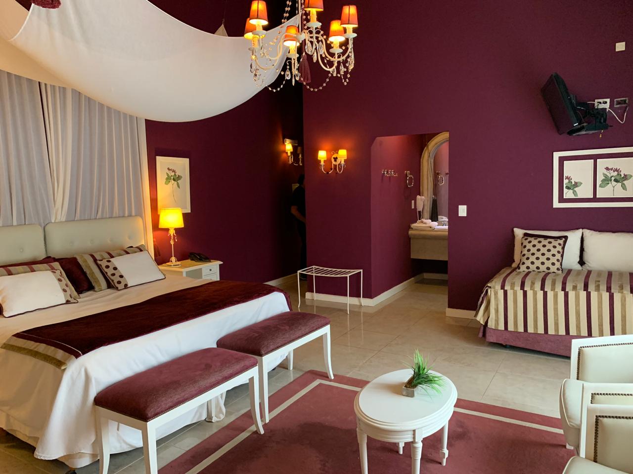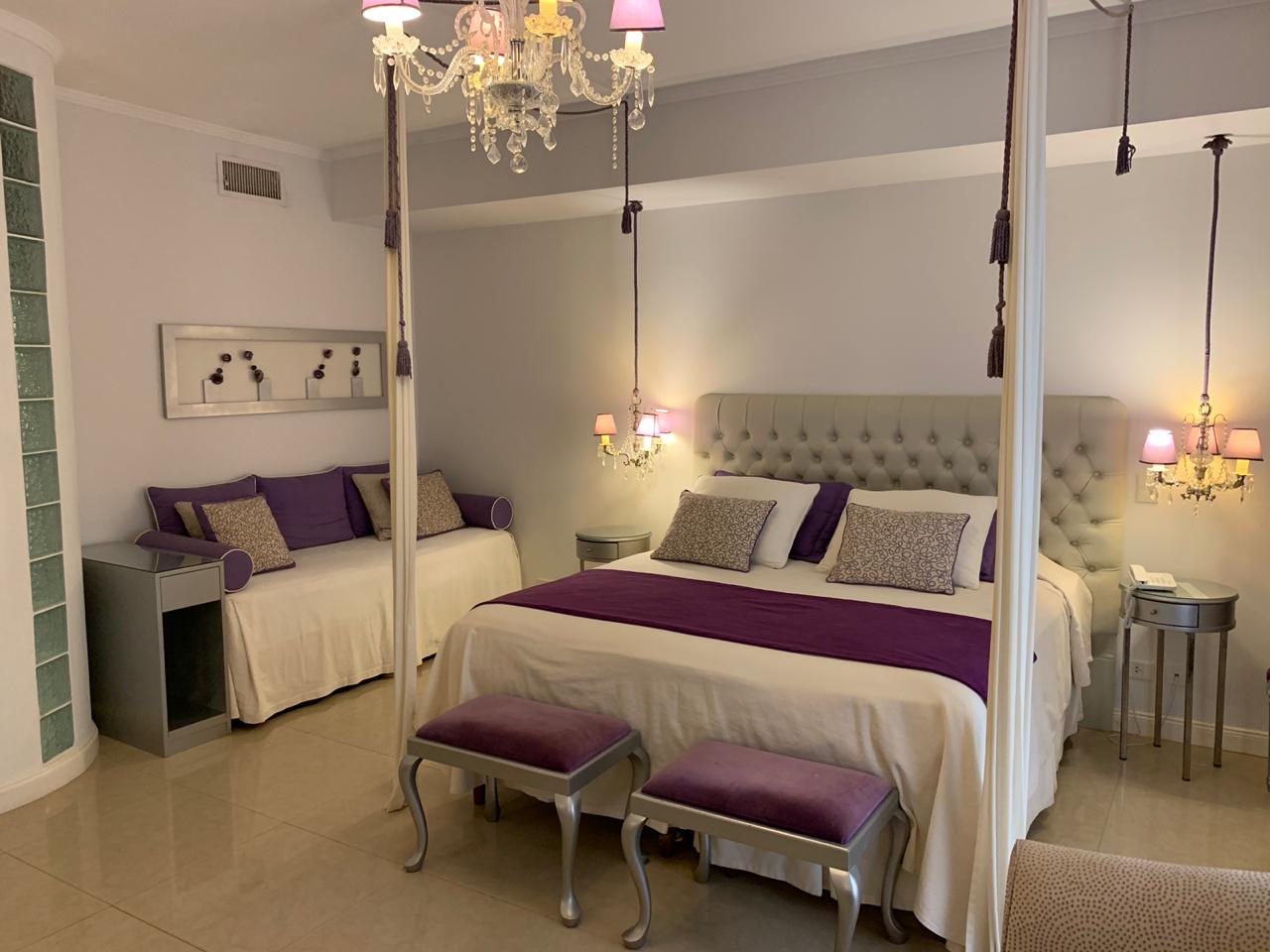 Suites Imperiales de 4 plazas (sommiers), con acceso directo a la piscina cubierta climatizada. Muy amplias. Impactante decoración. Equipadas con aire frío-calor, frigo bar,